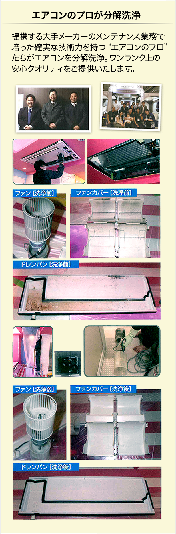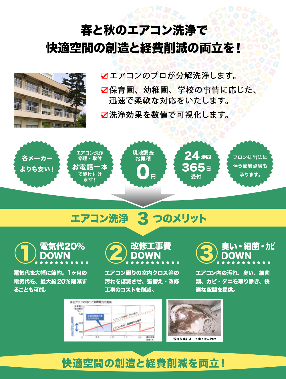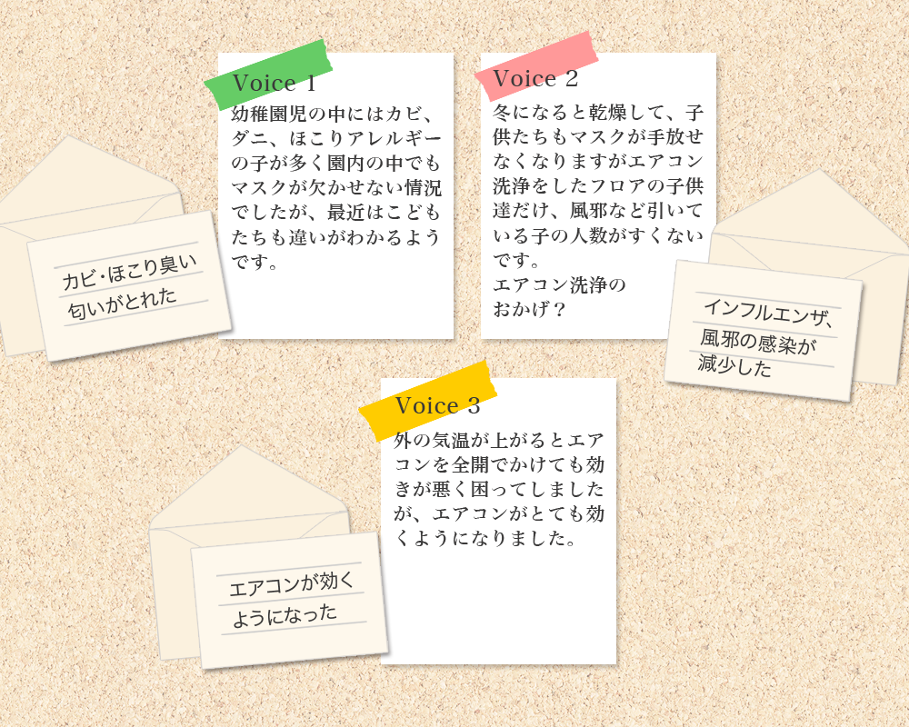 エアコン内部にはカビやダニや雑菌などのアレルゲン物質がたまりやすく、子どもたちはもとよりスタッフの健康のためにも、定期的なエアコン洗浄は欠かせません。