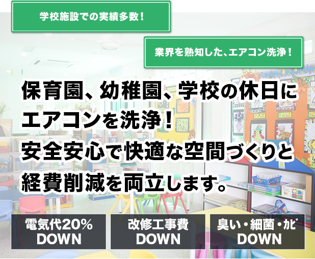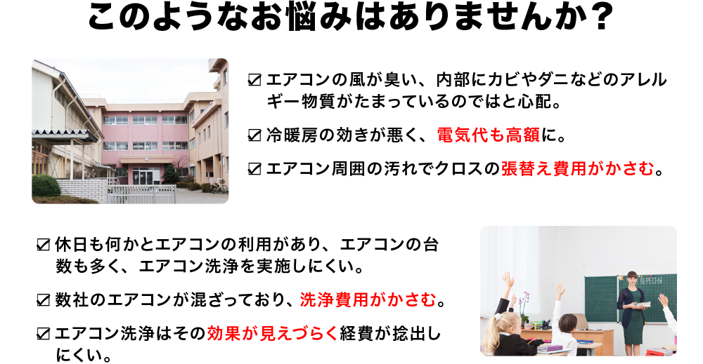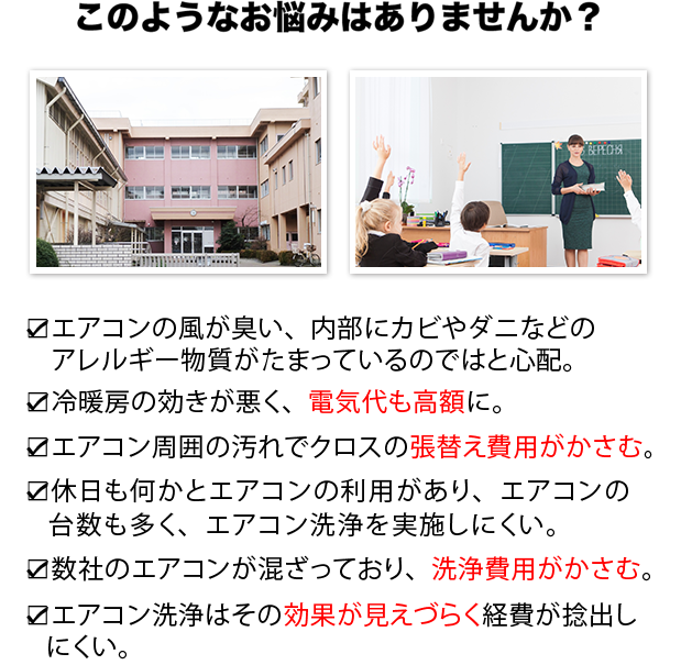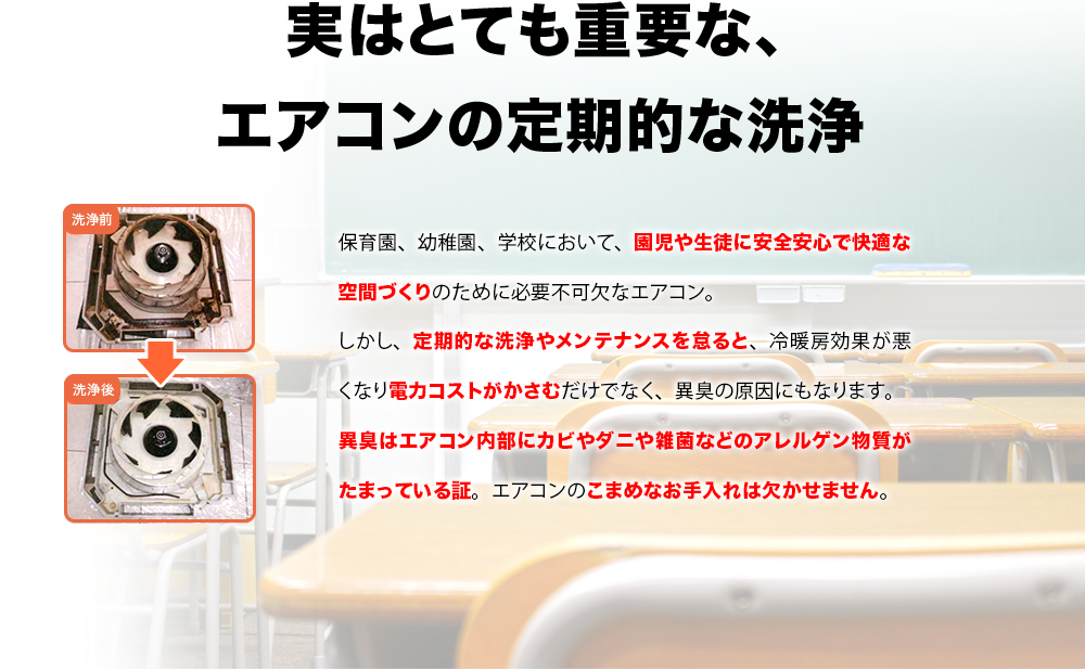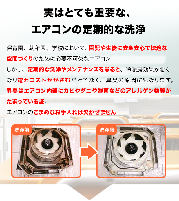 プレイルームや教室、職員室などの気になる臭いの大きな原因はエアコン内部の汚れ。特に大人数が絶えず出入りするためホコリも多く、新品のエアコンでも、ひと夏使用すると内部は汚れでベトベトに。