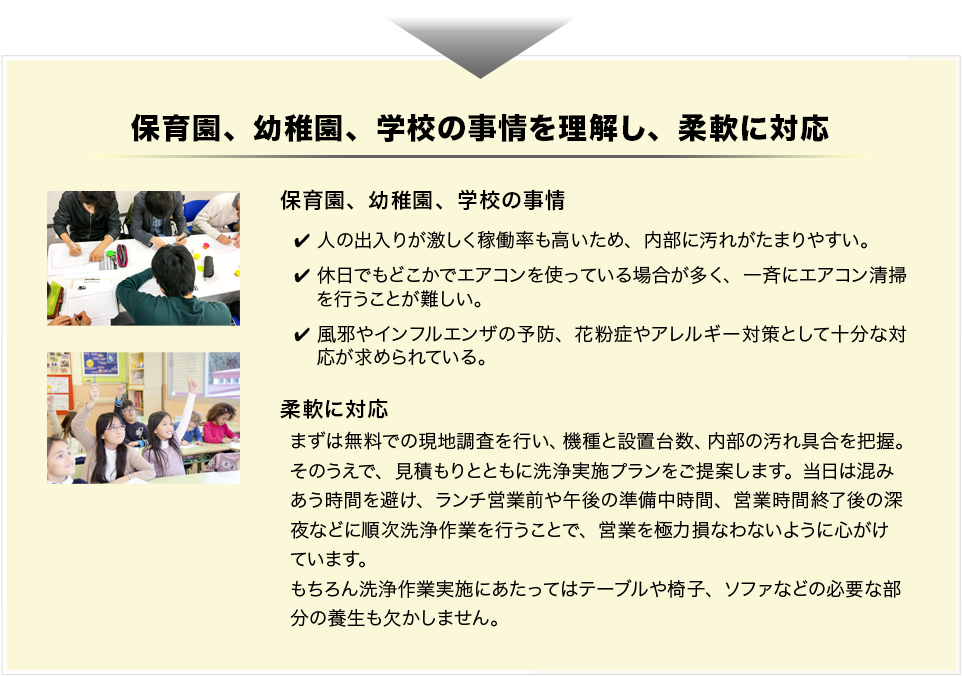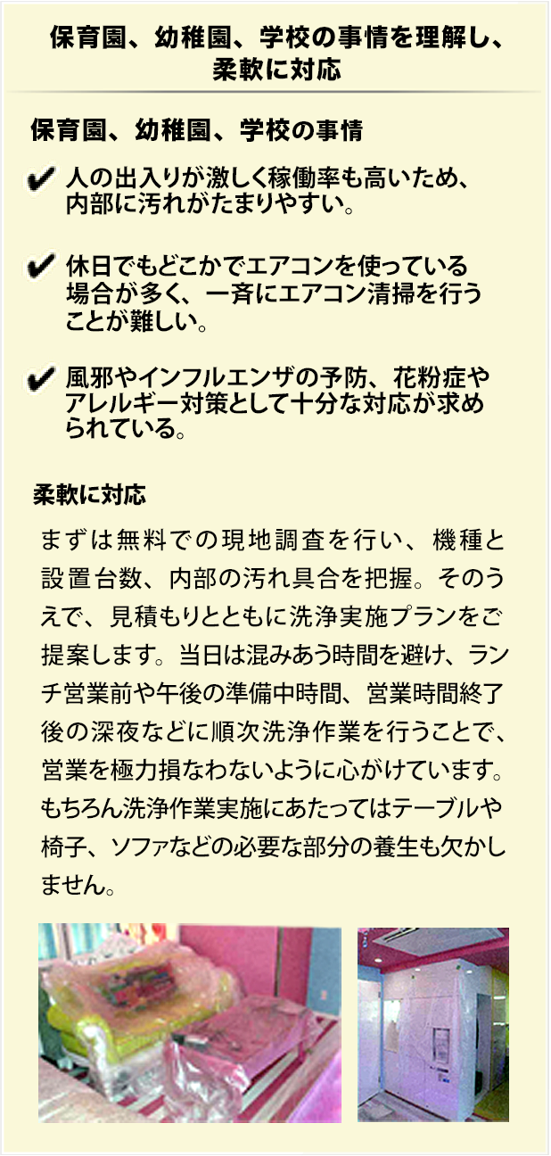 保育園、幼稚園、学校では人の出入りが激しいためエアコン内部はとても汚れやすい環境です。