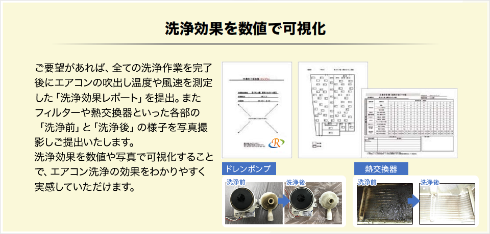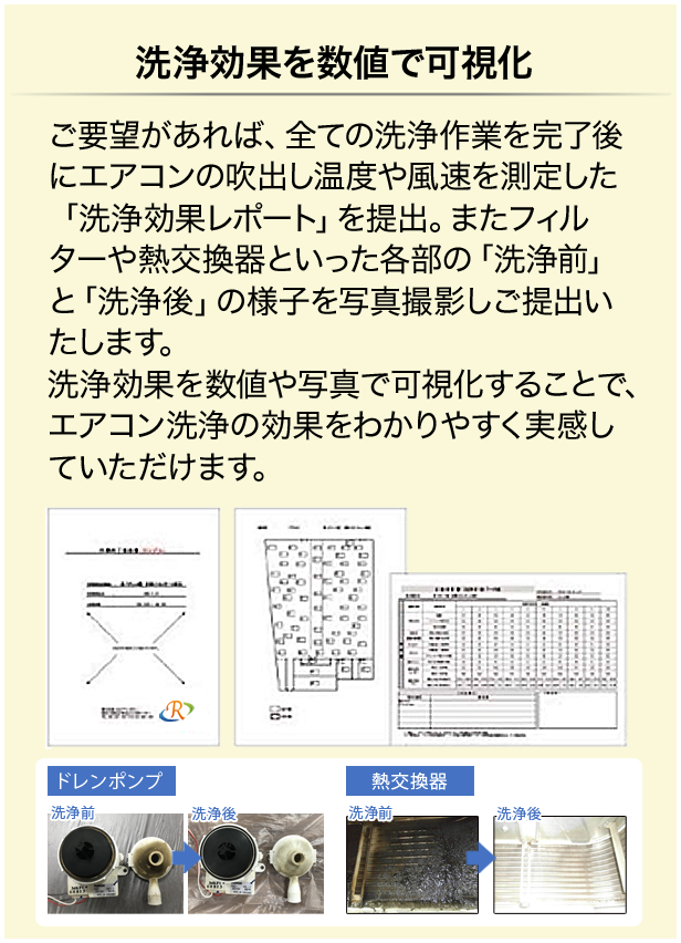 ご要望があれば、全ての洗浄作業を完了後にエアコンの吹出し温度や風速を測定した「洗浄効果レポート」を提出。またフィルターや熱交換器といった各部の「洗浄前」と 「洗浄後」の様子を写真撮影しご提出いたします。