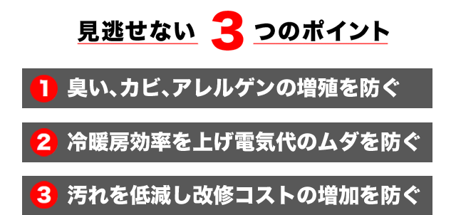 エアコン内部の汚れはエアコン吹き出し口周囲の天上、壁のクロスの汚れの原因となります。エアコンを定期的に洗浄することでクロスの汚れを低減し、改修コストの増加を防ぐことができるのです。
